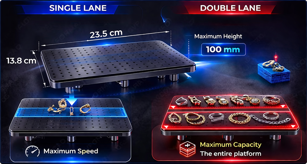 It can work in single lane mode , ideal for achieving maximum speed performance, or in dual lane mode , allowing you to print larger objects or use the entire area for full capacity production.